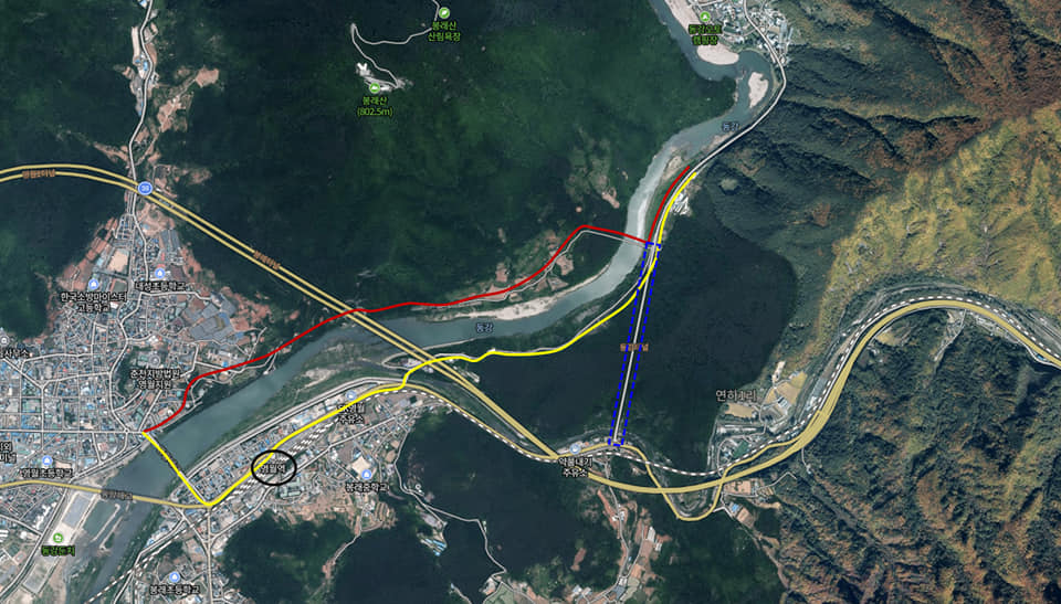 사병으로 의무 복무를 마치고, 고향에 돌아와 삼옥에서 영월읍내까지 지개를 지고 강을 건너는 불편함을 없애고자 나서서 주장하여 동네분들과 함께 맨손으로 뚫었던 길이 사진의 우측(노랑) 길입니다.