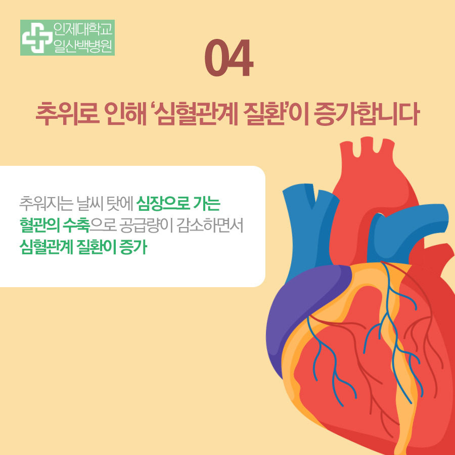 넷째, 추위로 인해 심장으로 가는 혈관 수축의 공급량이 감소하면서 '심혈관계 질환'이 증가합니다.