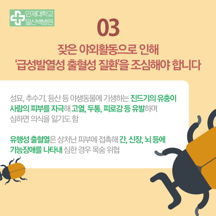 셋째, 야외활동이 잦아지면서 '급성발열성 출혈성 질환'을 조심해야 합니다.