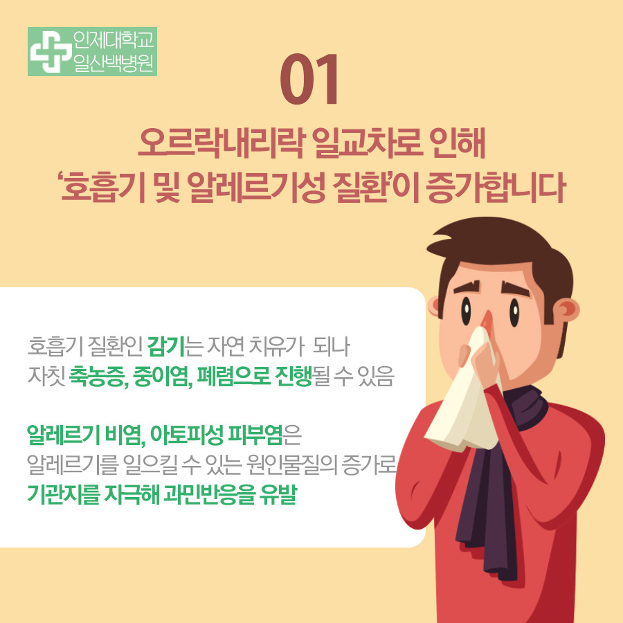 첫째, 일교차가 심한 가을에는 '호흡기 및 알레르기성 질환'이 증가합니다.