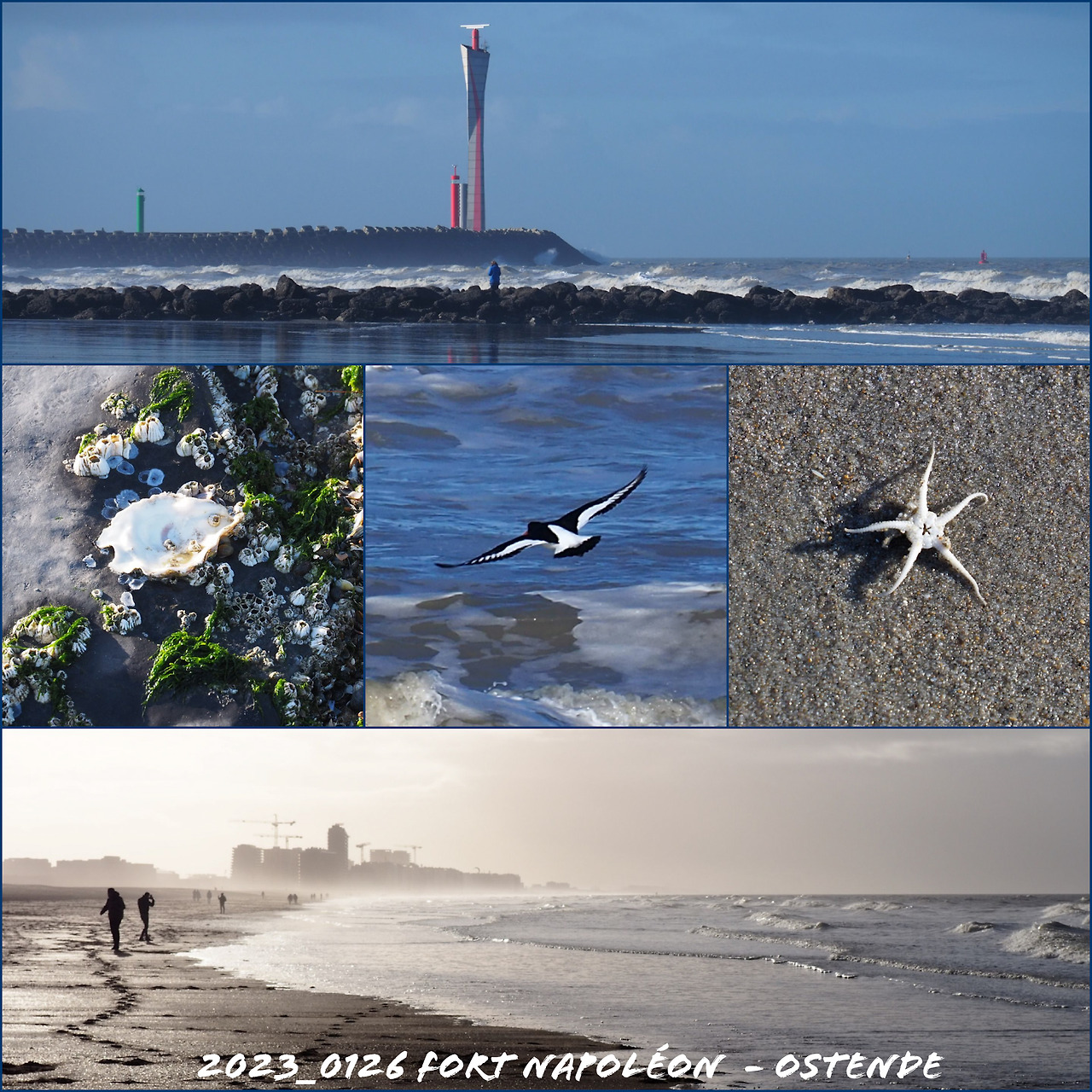 Nous avons commencé la promenade à la plage près du Fort Napoléon. Comme la marée était basse, c'était un bon moment pour observer des animaux sur cette vaste plage : des huîtres collées sur les brise-lames, des huîtriers pie au bord de l'eau et aussi une rarissime étoile de mer sur le sable.