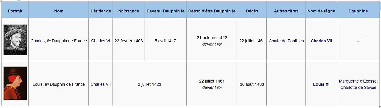 1. 프랑스 왕 샤를 6세는 정신병을 앓고 있었는데, 왕비 이자보와 영국 왕 헨리 5세가 1420년에 트루아조약을 체결해서, 샤를 6세의 사후에 영국의 왕 헨리 5세와 그의 계승자가 영국과 프랑스의 공동 왕위를 차지하도록 결정합니다. 당시 왕세자(Dauphin: 도팽)였던 샤를은 샤를 6세의 왕위 계승권을 박탈당하지만, 1422년 샤를 6세가 죽자 아르마냑파와 왕당파의 지지로 프랑스의 왕인 샤를 7세가 됩니다. 이때를 기해서 그의 도팽 칭호는 없어지고, 아들인 루이가 1423년부터 도팽이 됩니다. 한국으로 치면 왕세자가 왕이 되면 세자라는 칭호가 없어지는 것과 같습니다.