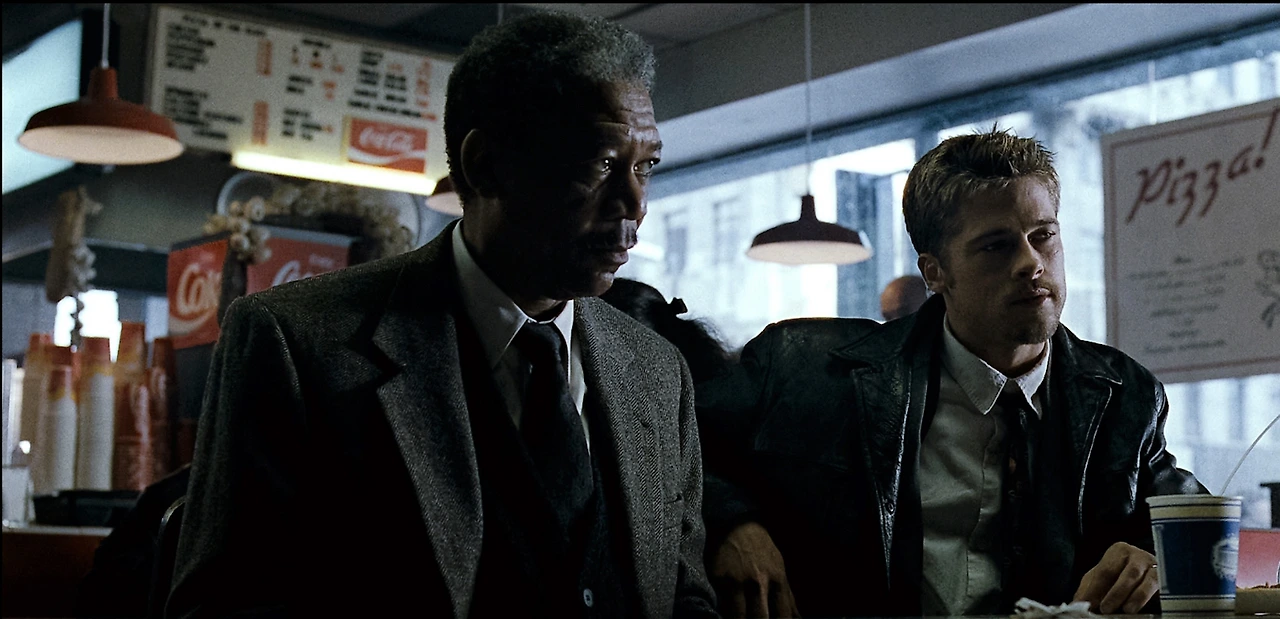 현) 고담시티의 개발 전 모습을 닮은 듯한 영화 속의 구) 회색도시도, 명확한 지명을 이야기하고 있지는 않지만 어딘가에 있을 법한 모습을 하고 있다고 느끼는 데에는 비(rain)의 역할이 매우 크다. 밀스(브래드 피트)도, 서머셋(모건 프리몬)도. 형사 월급으로는 우산조차 살 수 없냐는 의심이 들 만큼. 살인 현장을 조사하기 위해 실내에 있을 때를 제외하고는 이 비에서 자유로울 수가 없다. 그 상황이 양손에 커피를 들고 있을 때건, 아직은 용의자에 불과한 존 도(케빈 스페이시)를 쫓을 때건 상관없다. 서머셋이 내쉬는 한숨의 열 번 중에 두 번 정도는, 그가 비 때문에 도시를 떠나겠다는 생각을 했다고 믿을 수 있을 정도로. 존 도의 살인이 없을 때마저도 우울한 것만 같은 도시의 분위기 구축에는 비가 매우 큰 역할을 한다.