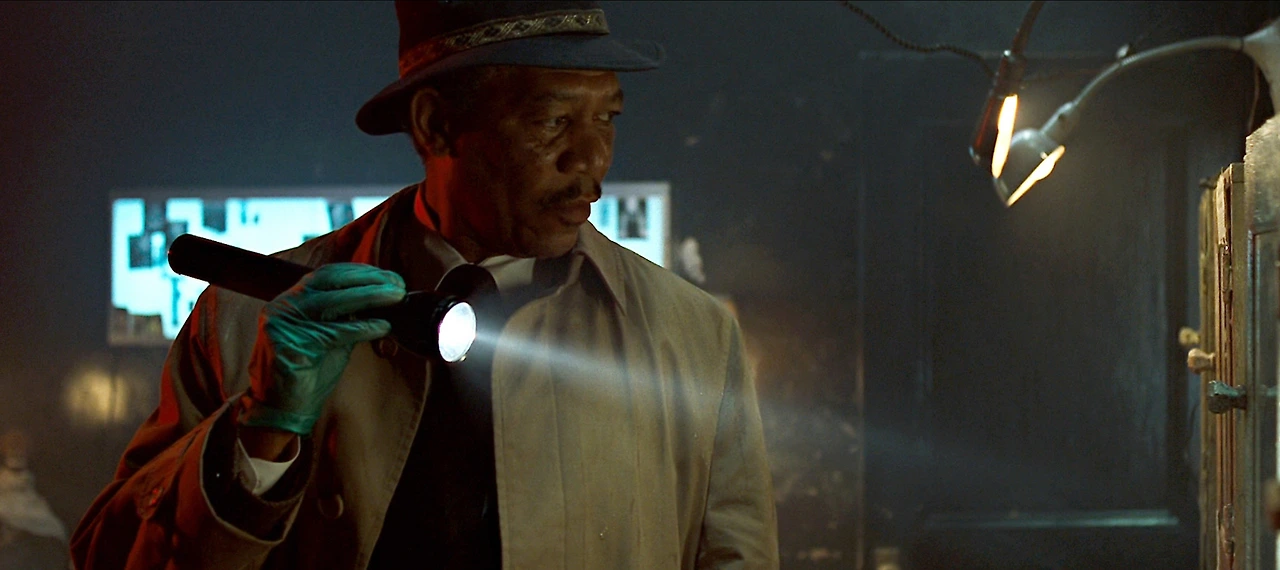 도시도, 그 안에 살고 있는 사람도. 작품 속 모든 것은 회색이다. 흰 것과 검은 것으로 대변할 수 있는 양 측이 섞였을 때 나오는 색이 그것이건만. 영화는 이 회색으로 통칭되는 것들에도 스펙트럼이 있음을 시사한다. 가장 흰색에 가까운 사람을 뽑자면. 아마도 그것은 서머셋일 것이다. 그러나 이런 서머셋 마저도 완벽한 흰색을 띠고 있지 않다. 베테랑 형사, 어쩔 수 없는 사건 외엔 모두 해결한 형사라는 타이틀 아래에서도, 부정한 방법으로 FBI에게서 조사 자료를 얻어낸다. 여태껏 그래왔다는 듯이. 그리고 이 방법 외에는 없다는 듯이.