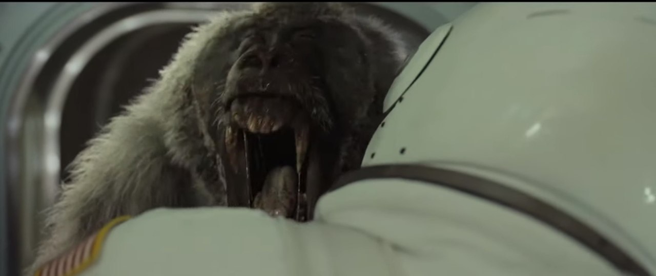 3 이 영화 ‘애드 아스트라’에서 결국 인류는 지적 외계 생명체를 찾지 못할 뿐만 아니라 흔적 조차 발견하지 못한다. 대신 인간 스스로 생각하기에 인간보다 지적으로 못하다고 여기는 실험용 유인원을 우주공간에서 마주하게 된다. 유인원의 분노를 맞닥뜨리고 그 분노를 이해한 순간, 로이는 비로소 자신의 감정의 심연을 들여다 보고, 자기 자신에게 감정적으로 솔직해지는 계기가 된다. 유인원을 만난 후 화성에서 세피우스 우주선을 탈취해서 해왕성으로 가는 과정은 로이가 정서적으로 새롭게 태어나는 과정이다. 79일 동안 해왕성까지 가기 위해 자신의 배를 뚫어 급식 튜브를 연결하여 영양을 공급받는 것은 탯줄을 연상시킨다. 벽에 붙어있는 물주머니의 꼭지를 빠는 것은 젖을 먹는 아이의 모습 같으며, 물주머니를 빨아 물을 마시는 숏 바로 다음 숏이 로이가 어렸을 때 어머니에게 안겨있는 플래시백 숏이라는 것을 감안하면 이러한 연상을 더욱 강화시켜준다.