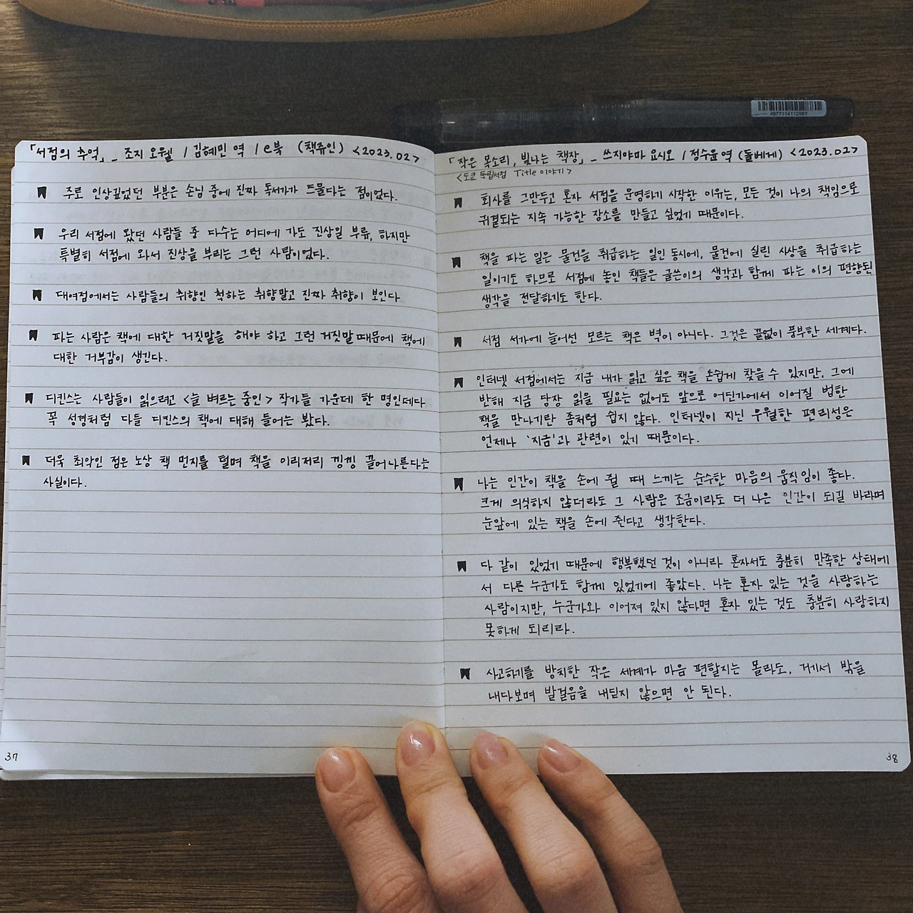 읽으며 밑줄 친 문장들을 밑줄 노트에 필사한다. 나중에 인용하거나 다시 한번 읽어 보고 싶은 문장들은 대부분 밑줄 친 문장들인데 시간이 지난 뒤에 그 문장만을 다시 찾기란 여간 어려운 일이 아니다. 재미있는 것은 방금 다 읽은 책의 밑줄 친 문장을 필사하는 것인데도, 대체 이 문장에 밑줄을 왜 친 건지 이해 안 될 때가 있다는 것이다. 다 이유가 있었겠거니 생각하며 필사는 한다. 책에 밑줄을 많이 치며 읽는 편인데, 그래서 남에게 책을 빌려주는 것을 좋아하지 않는다. 20대 초반에 쓴 밑줄 노트들을 보면서 어릴 적 일기를 읽는 듯한 부끄러움을 느낀 적이 있다. 그 노트들은 결국 쓰레기통으로... 지금 이 노트도 언젠가 나를 부끄럽게 할 날이 올까?