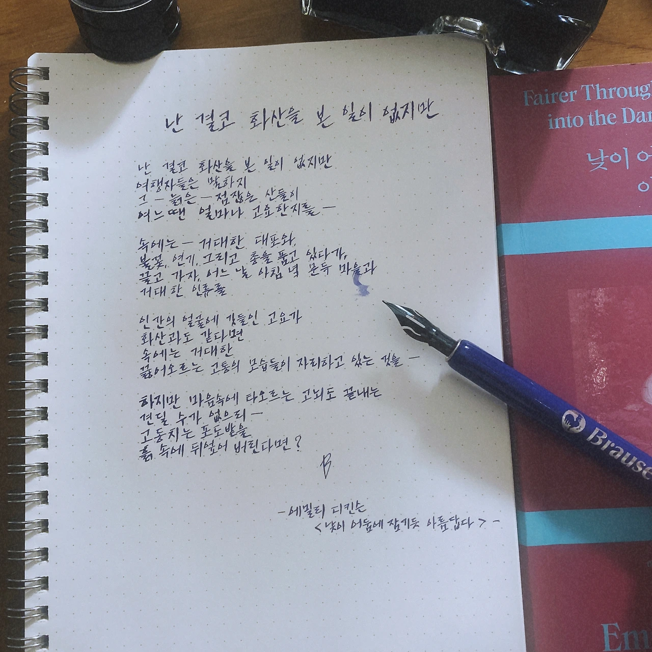 이 중에서 '이 글씨는 참 흡족하군' 하는 것은 하나도 없는데, 그래도 고무적인 부분은 딥펜 다루는 법에 조금 익숙해지고 있다는 것이다. 필압 조절이 조금씩 가능해지고 있다. 딥펜 놀이도 한 번 잡으면 시간 가는 줄 모르고 마냥 붙들고 있어서 30분 타이머를 맞춰 두고 진행했다. 30분만 했다는 말은 아니지만..