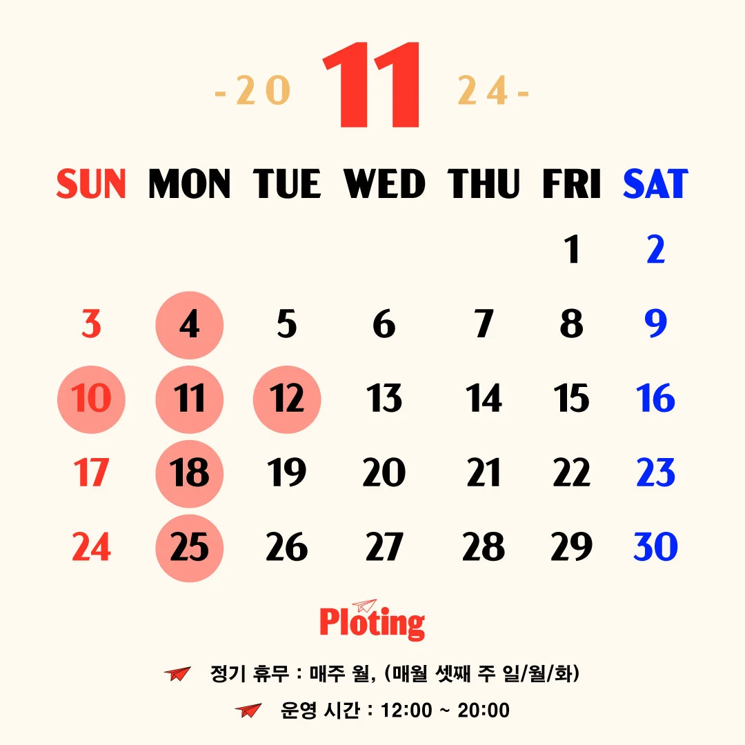 11월부터는 휴무일이 변경되어 다시 주 6일 체제 돌입. 대신 셋째 주 일월화를 쉬어 중간 쉼표를 찍을 수 있게 되었다. 고정 휴무일이 주 5일제보다는 줄어든 만큼, 11월부터는 쉬는 날 절대 출근 안 하기로 다짐해 보며...! 10월의 플로팅도 무사히 마무리되었습니다! 11월의 플로팅은 또 무슨 일들이 일어날지 기대해 보며, 11월에 만나요~~!!