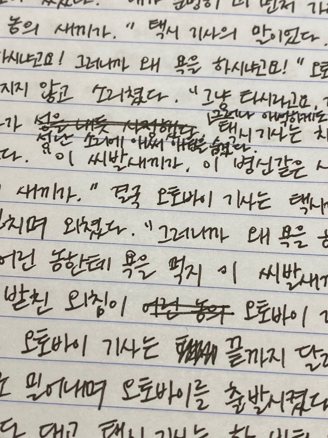 맥락 없이 쏟아지는 거친 욕들 사이로 드문드문 문장다운 문장이 포함되었다. "내가 분명히 너 먼저 가라고 했지! 이 어린놈의 새끼가." 택시 기사의 말이었다. "왜 욕을 하시냐고요, 그러니까 왜 욕을 하시냐고요!" 오토바이 기사도 지지 않고 소리쳤다. 한참을 의미 없는 욕과 욕이 오고 가다 오토바이 기사가 싸움을 끝낼 결심을 했다. "그냥 타시라고요, 가시라고요오오-" 성난 소리 뒤로 애써 애원을 숨기며 이제 그만 싸움을 끝내고 싶다는 의사를 전달했다. (가시라고요오오의 늘어지는 말끝이 내게는 절박한 요청 혹은 애원처럼 들렸다. 물론 이건 단지 나의 생각일 뿐이지만.)