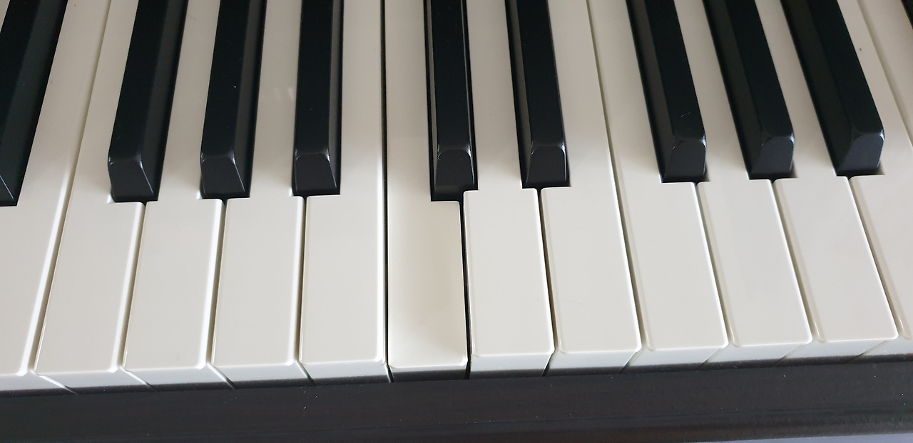 피아노 건반 하나가 눌려 있다. 그곳에 아이의 핸드폰이 자리 잡았나 보다.