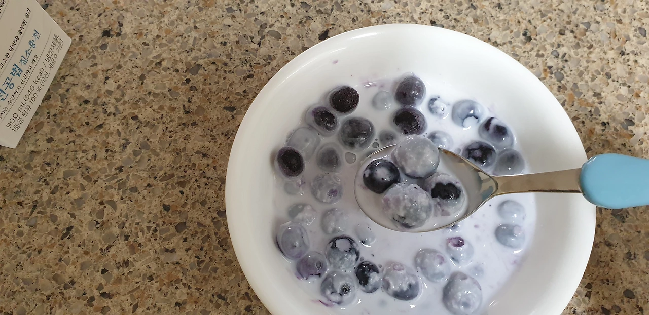 하는 노래처럼 한창 꽂혔을 때는 하루에 서너 번씩 냉동 블루베리를 먹었다. 요즘은 그나마 덜해져서 하루에 한두 번이지만 아이는 먹을 때마다 맛있다며 감탄을 한다.