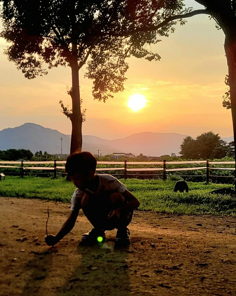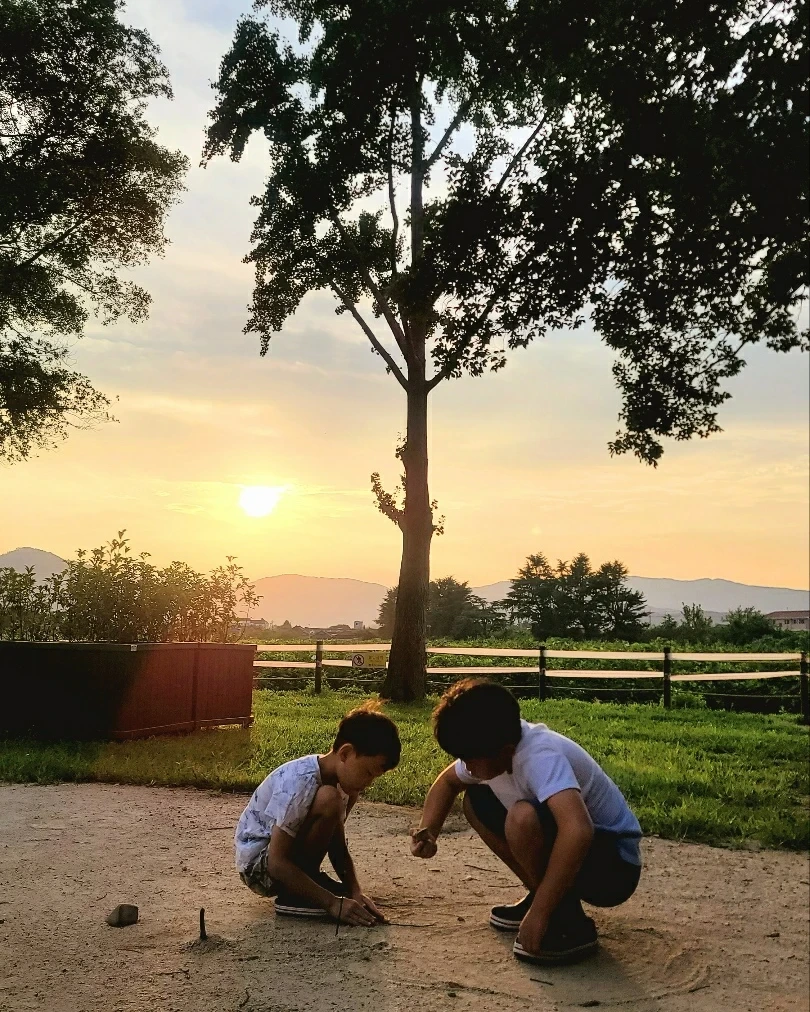 석양 아래 땅 파는 소년들