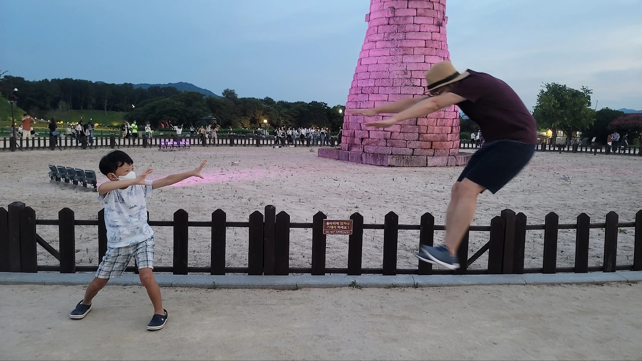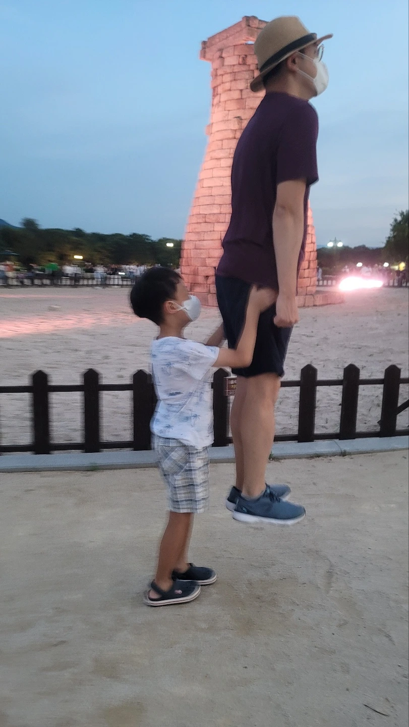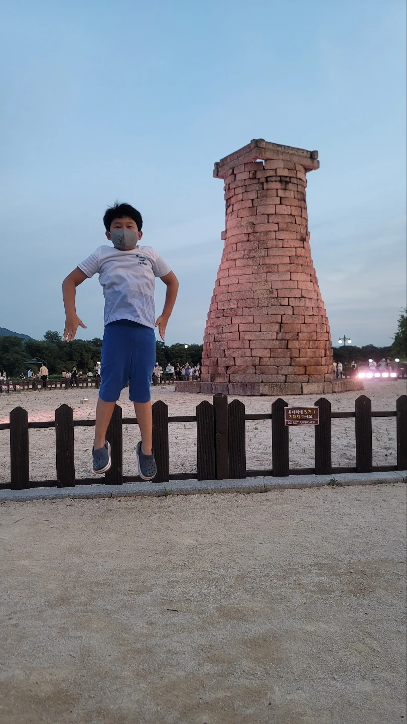 첨성대에서는 점프 사진을 잔뜩 찍었다. 5년 전 첨성대 앞에서 큰 아이가 점프했던 사진을 재현하려고 시도한 건데, 어쩌다 보니 남편의 묘기 대행진이 되었다. 아이들도 아빠의 컨셉 사진에 동참하였고 좋은 아이디어도 냈다. 큰 아이가 아빠 점프할 때의 순간을 기가 막히게 포착하여 좋은 사진사 역할을 하였다. 벤치에 앉아 삼부자가 사진 찍는 모습을 바라보며 솔솔 부는 산들바람을 맞고 있자니 평화롭고 좋았다.첨성대는 이제 우리 가족에게 웃기는 사진을 남긴 장소로 기억될 것 같다.