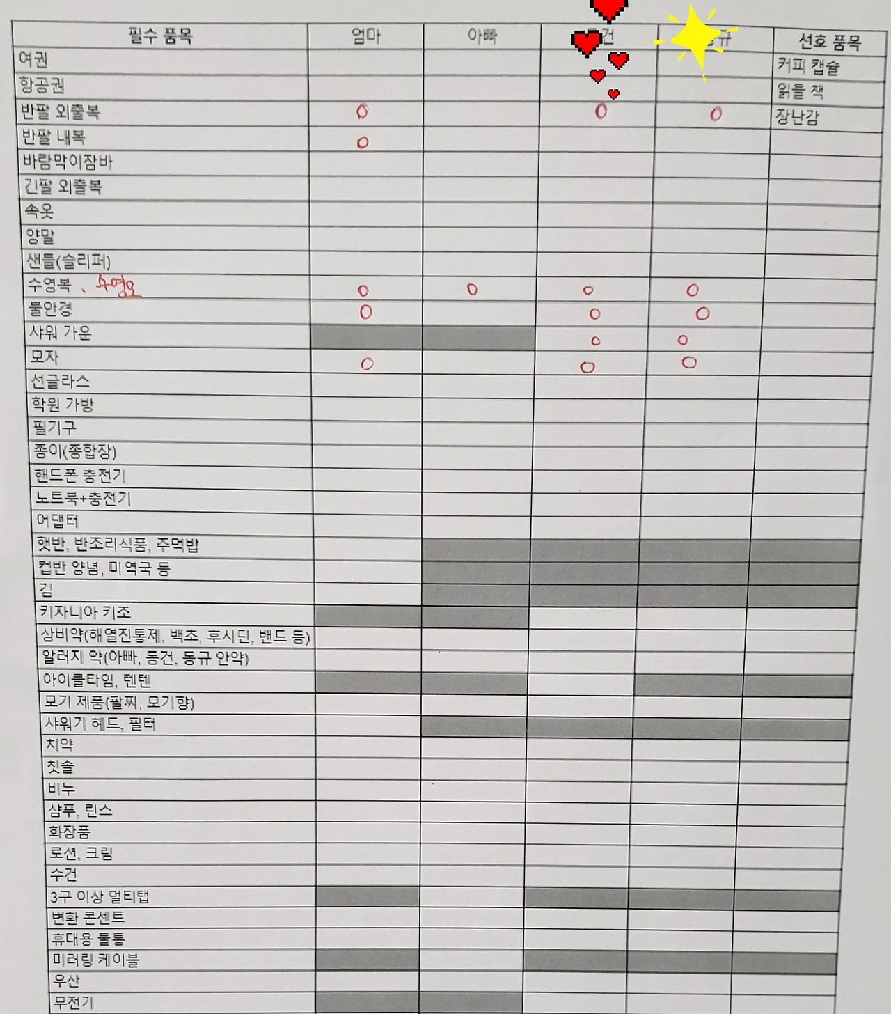 파일을 만들기까지가 귀찮아서 그렇지, 막상 만들어 놓으니 편하다. 리스트대로만 챙기면 문제 없을 테다. 리스트 작성 후 추가로 생각나는 준비물은 언제든 추가하면 된다. 나는 준비물 리스트를 프린트하여 옷장에 붙여놓고 추가로 생각나는 준비물은 표 아래에 수기로 적었다. 먼저 챙겨놓은 짐은 동그라미를 치고 더 이상 신경 쓰지 않았다. 예전에 머리를 믿고 짐을 챙길 땐 내가 챙겼는지 안 챙겼는지 불확실해서 짐을 다시 들추는 일도 있었으나, 이번엔 그러지 않아도 됐다.
