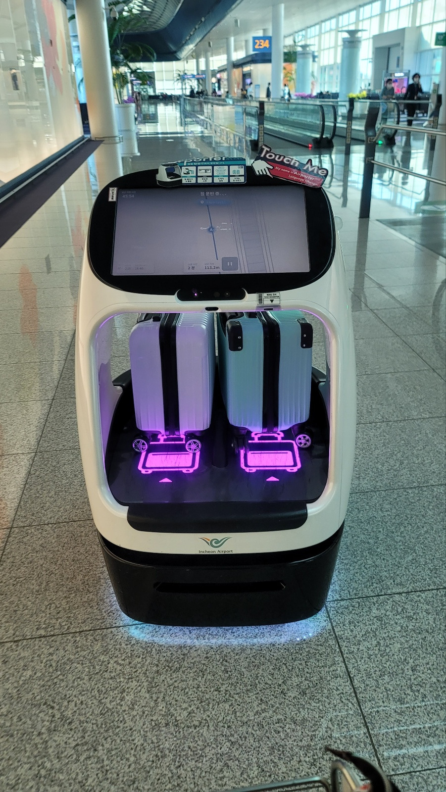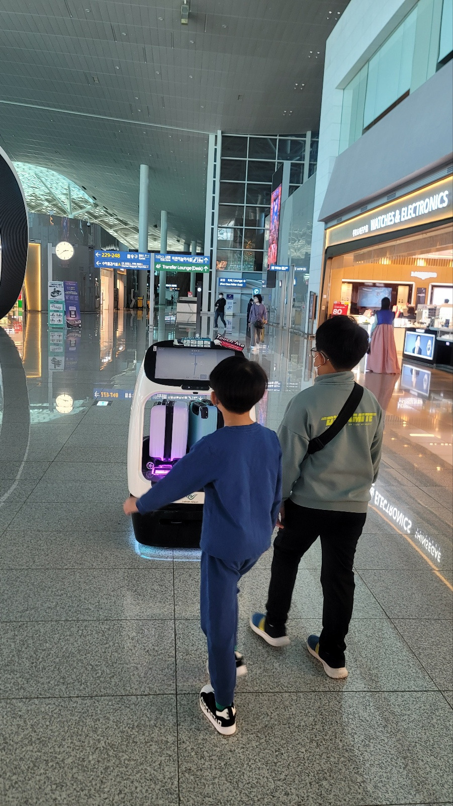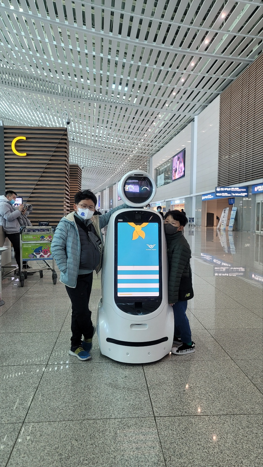 라운지에서 게이트까지는 거리가 꽤 멀었다. 걷다가 재미있는 걸 발견했다. ‘에어포터’라는 로봇이었다. 사실 인천공항에는 인기 스타 로봇이 있다. 바로 '에어스타'다. 에어스타는 공항을 안내해주고 사진도 찍어주는 로봇이다. 그런데 못 본 사이 에어포터라는 녀석이 새로 생겼다. 에어포터는 노약자나 장애인 등 교통 약자의 짐을 게이트까지 갖고 가주는 로봇이다. 탑승권 QR 코드를 찍었더니 짐을 올려놓으라는 메시지가 뜬다. 아이들의 캐리어 두 개를 에어포터에 실었다. 에어포터는 편안한 음악 소리를 내며 전진한다. 앞에 장애물이 있으면 기가 막히게 방향을 튼다. 문제는 속도가 느리다. 느려도 너무 느리다. 처음에는 에어포터를 졸졸 따라가다가 나와 아이들은 먼저 앞으로 갔다. 에어포터가 게이트에 도착하자, 남편은 에어포터에서 짐을 내렸다. 에어포터는 느리지만 충실하게 자기 임무를 수행하고 다른 손님을 찾아 유유히 길을 떠났다.