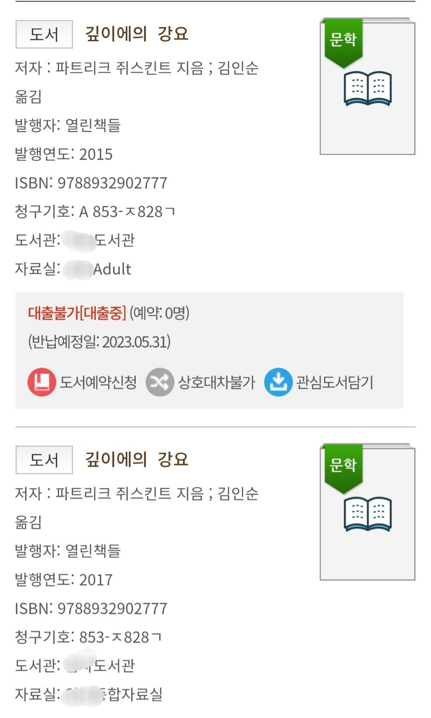"파트리크 쥐스킨트. 나오네요. 우리 도서관엔 없고 다른 도서관에 있어서 상호대차하면 되는데, 이 사람 책이 많네. 가만, 책 이름이 뭐였죠?"