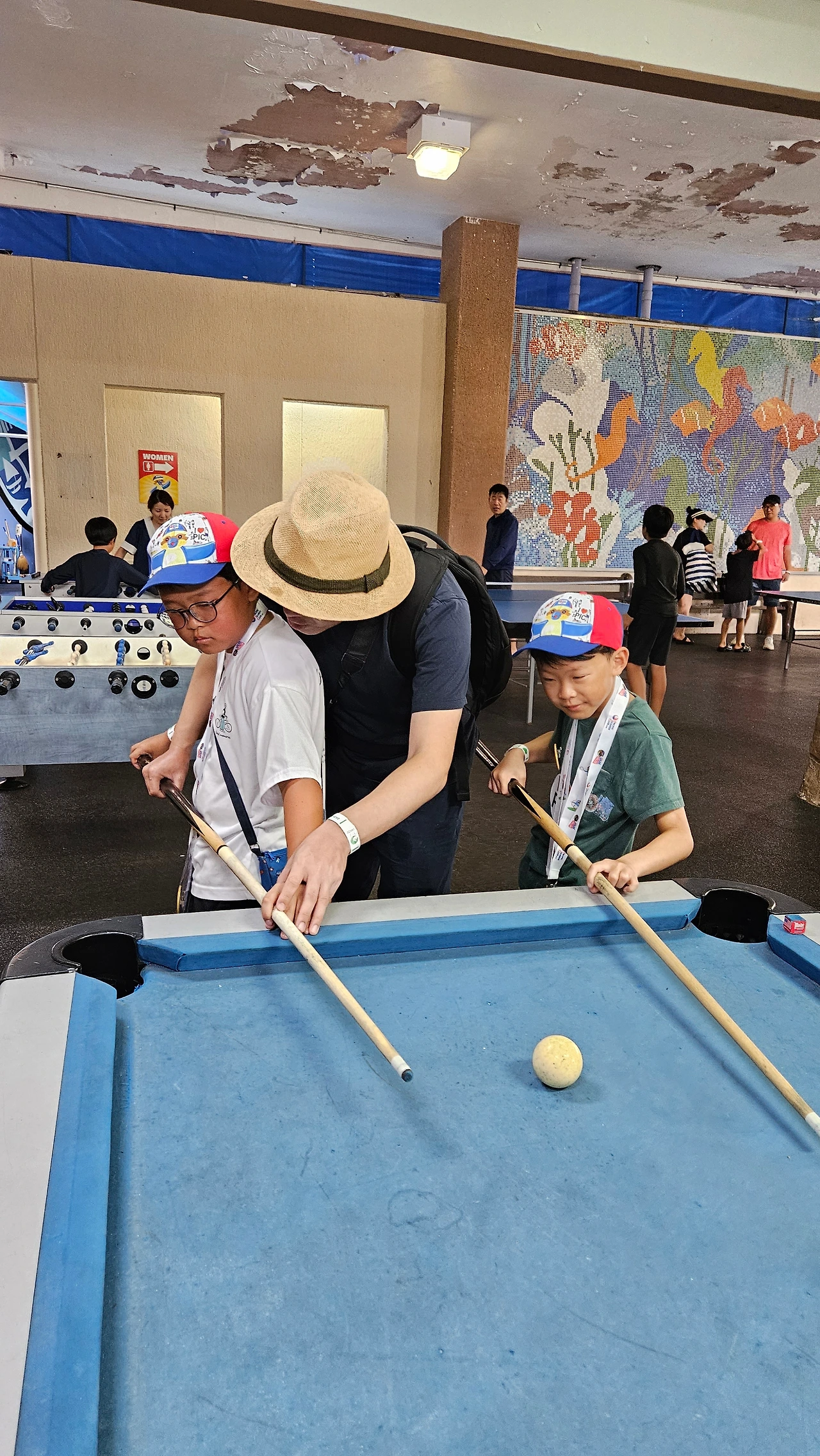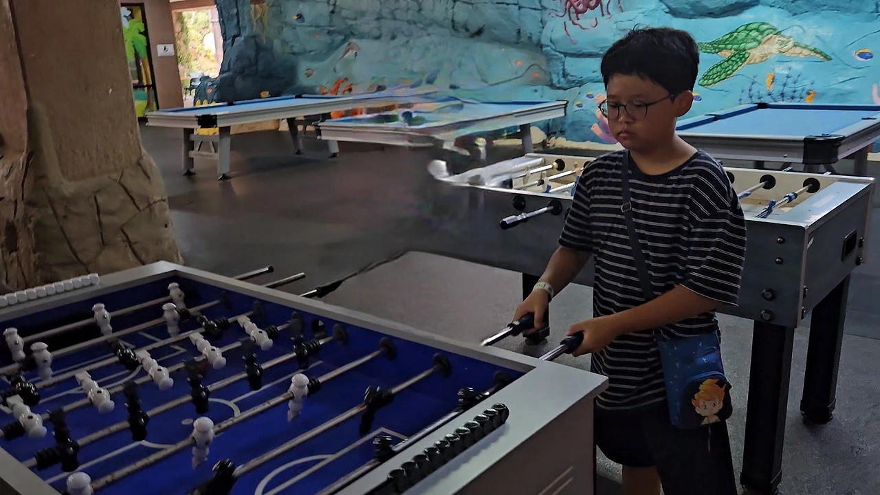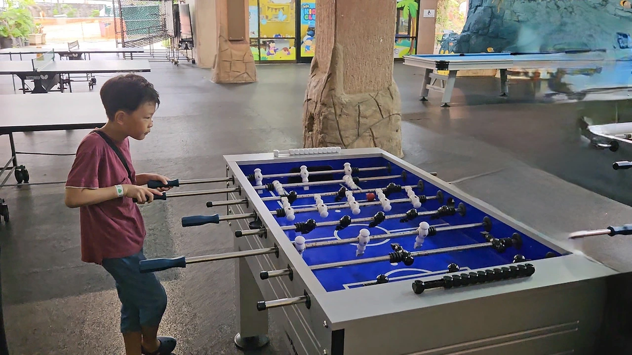 건이가 좋아하는 양궁은 이미 예약이 마감되었다고 하여 다음날에 하기로 했다. 탁구, 테이블 축구는 예약이 필요 없어서 바로 했다. 탁구는 (애들이나 어른이나) 쉽지 않아 몇 번 치다 말았다. 테이블 축구는 생각보다 재미있었다. 옛날 시트콤 <프렌즈>에서 챈들러랑 조이가 왜 그토록 테이블 축구에 집착하나 했었는데, 막상 해보니 의외로 재밌잖아? 둘씩 한 팀이 되어 경기를 했다. 한 명이 공격 쪽 스틱 두 개를 잡고 다른 한 명이 수비 쪽 스틱 두 개를 잡으면 된다. 참고로 나는 공식 '구멍'이라 공격을 하든 수비를 하든 전력에 도움이 되지 않았다. 남편이나 건이나 규나 나와는 한 팀이 되고 싶어 하지 않았다. (내가 우리 집에서 이런 입지가 아닌데 말이야!)