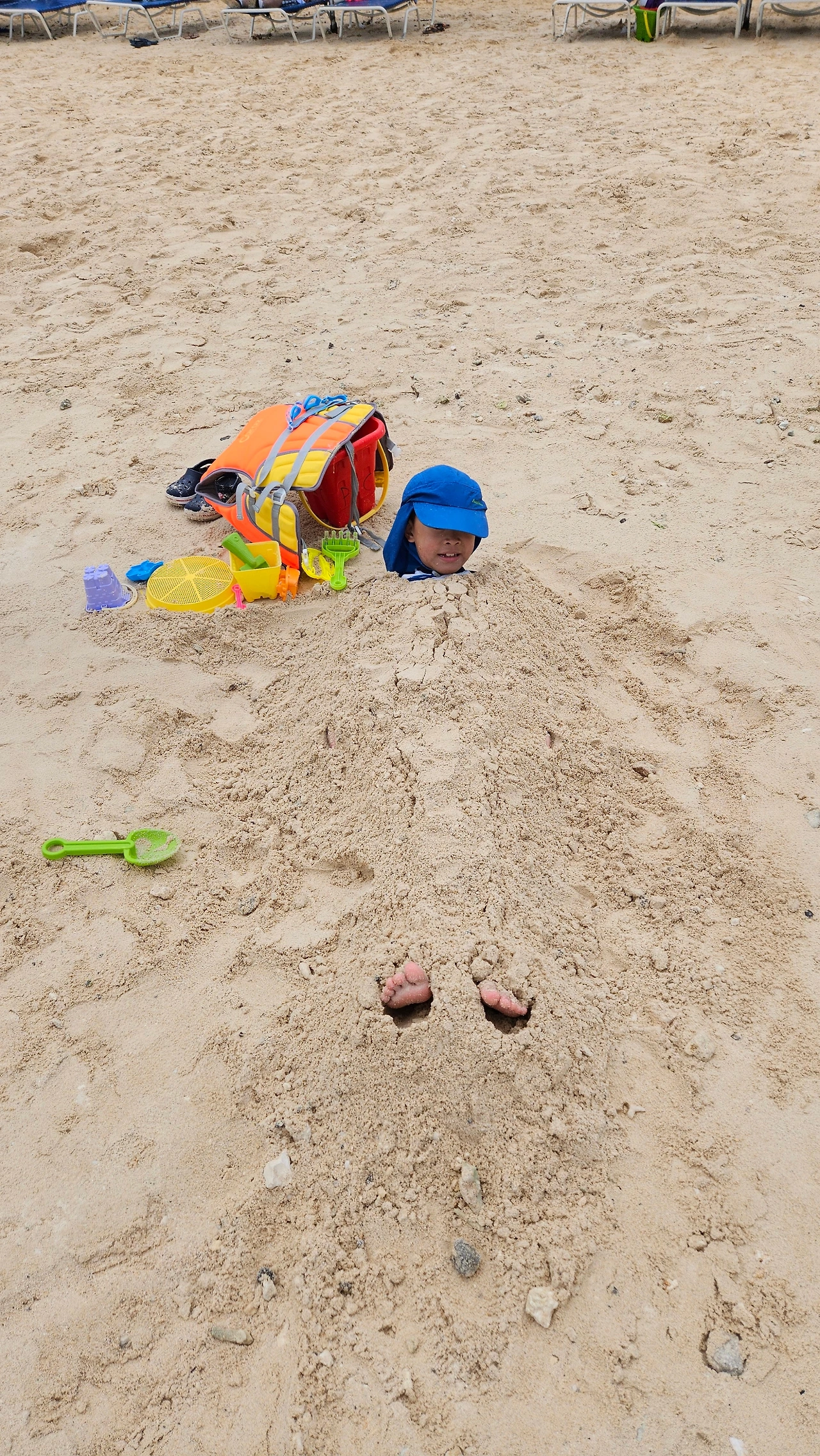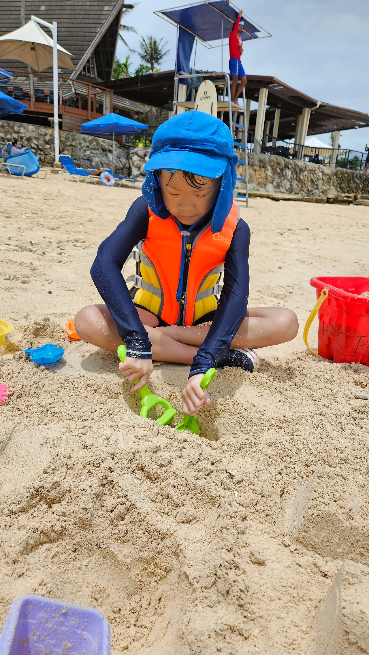 모래놀이를 하다가 스노클링을 하고 싶다고 하여 바다에서 물안경을 쓰고 살짝살짝 머리를 바닷물에 집어넣었는데, 한계가 있었다. 규는 스노클링 고글을 빌리자고 했다. 입에 무는 공용 장비를 별로 빌리고 싶지 않았지만, 사러 갈 수도 없고 이때가 아니면 스노클링 할 기회도 없을 것 같아서 그냥 빌렸다. 바닷물에 어련히 다 소독이 되겠거니 하고.