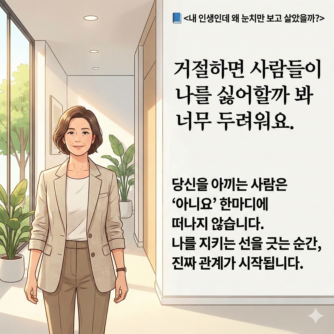 ✔️ 부모 세대 : [내 인생인데, 왜 눈치만 보고 살았을까?]- "눈치로 버틴 인생에서, 나로 사는 인생으로"