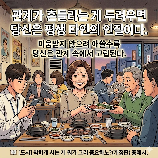 『착하게 사는 게 뭐가 그리 중요하노?』(개정판)은 심리 이론을 앞세우기보다, 사람들의 삶 속에서 그 감정을 따라가며 독자가 스스로 자신의 관계 패턴을 알아차리도록 돕는다.