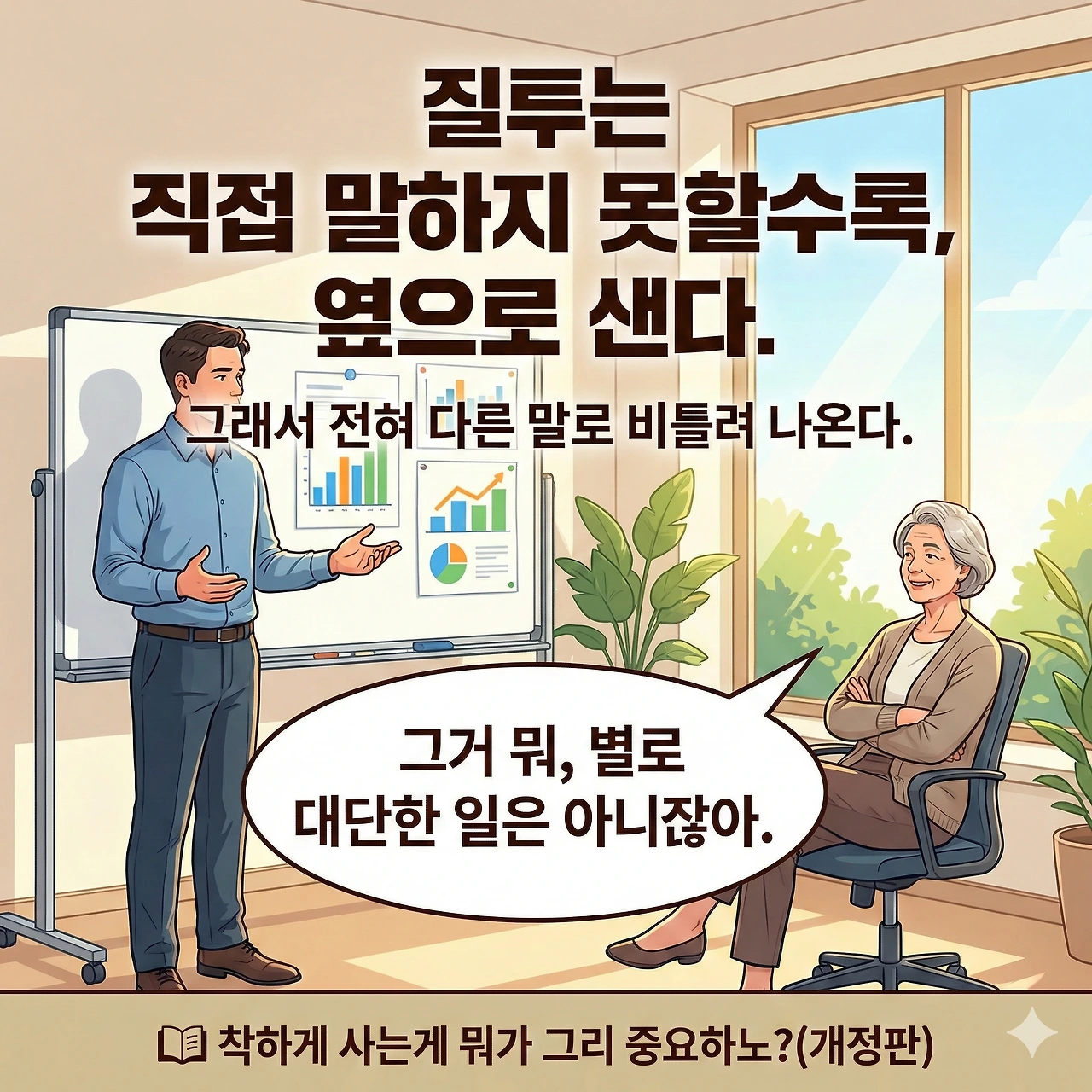 정면으로 인정하지 못한 감정은 옆으로 흐르고, 말의 온도를 낮추는 방식으로 나타난다.