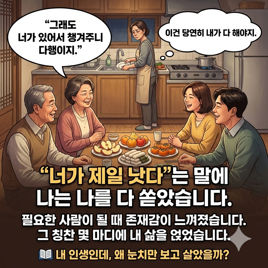✔️ 부모 세대 : [내 인생인데, 왜 눈치만 보고 살았을까?]- "눈치로 버틴 인생에서, 나로 사는 인생으로"
