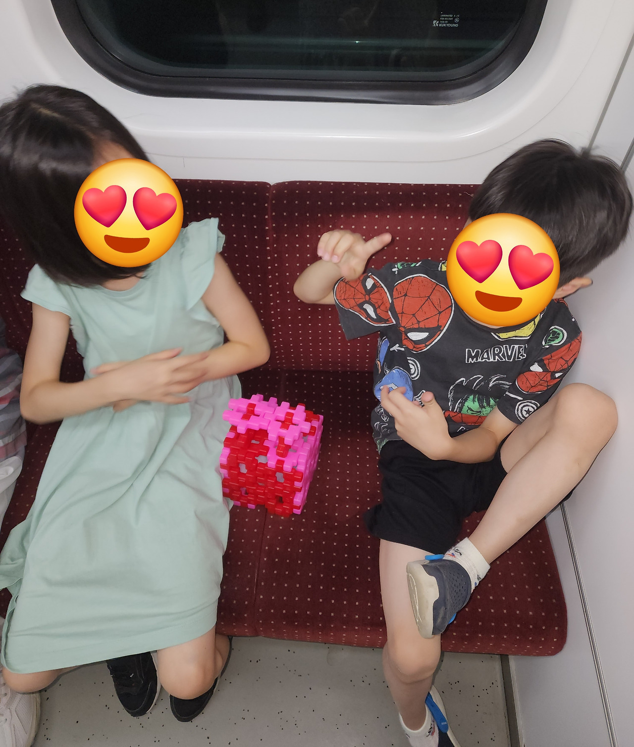 예상대로 가는 길은 즐거웠다. 옥수역을 지나며 아이는 토끼 인형에게 창밖 풍경을 보여주는 여유도 보였다. 그런데 체험장으로 가는 길, 첫째가 블록을 떨어뜨렸고 블록은 두 동강이 났다. 아이는 재빨리 주워 담았지만, 불길한 예감이 들었다. 아니나 다를까, 곧 소나기가 쏟아졌다. 다행히 미리 챙긴 우산 덕분에 체험장까지 무사히 도착했다.