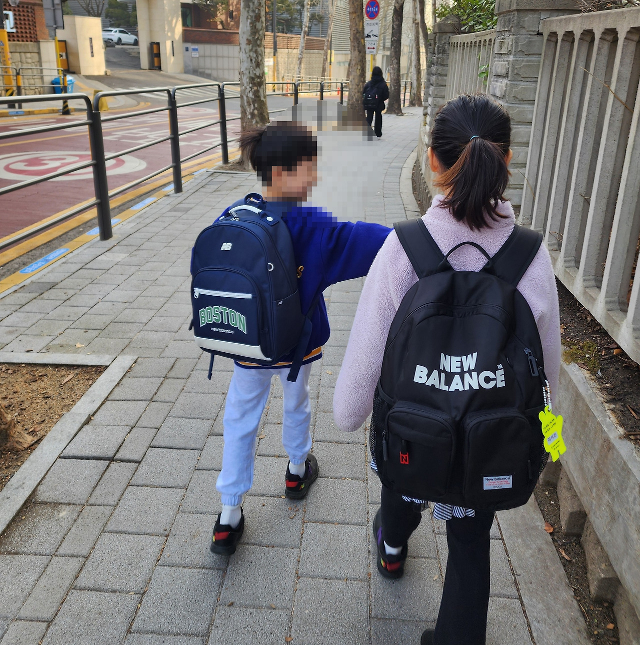 반면 첫째의 가방끈은 느슨하다. 자연스럽게 엉덩이까지 내려온 가방은 슬슬 초등학생의 무게감(?)을 드러내고 있었다. 가방은 아이의 느긋한 걸음을 따라 움직였다.
