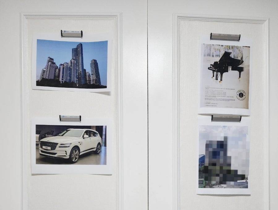 내가 앉아 있는 자리에서 고개를 들면 남편이 준비하고 있는 자격증 사진이 보인다. 그 옆에는 내가 다음 차로 사고 싶은 GV80, 남편이 살고 싶어 하는 도곡동 주상복합아파트, 그 아파트 거실에 놓고 싶어 하는 그랜드피아노 사진이 붙어 있다. 매수를 목표로 하는 삼성동의 한 건물 사진과 함께.