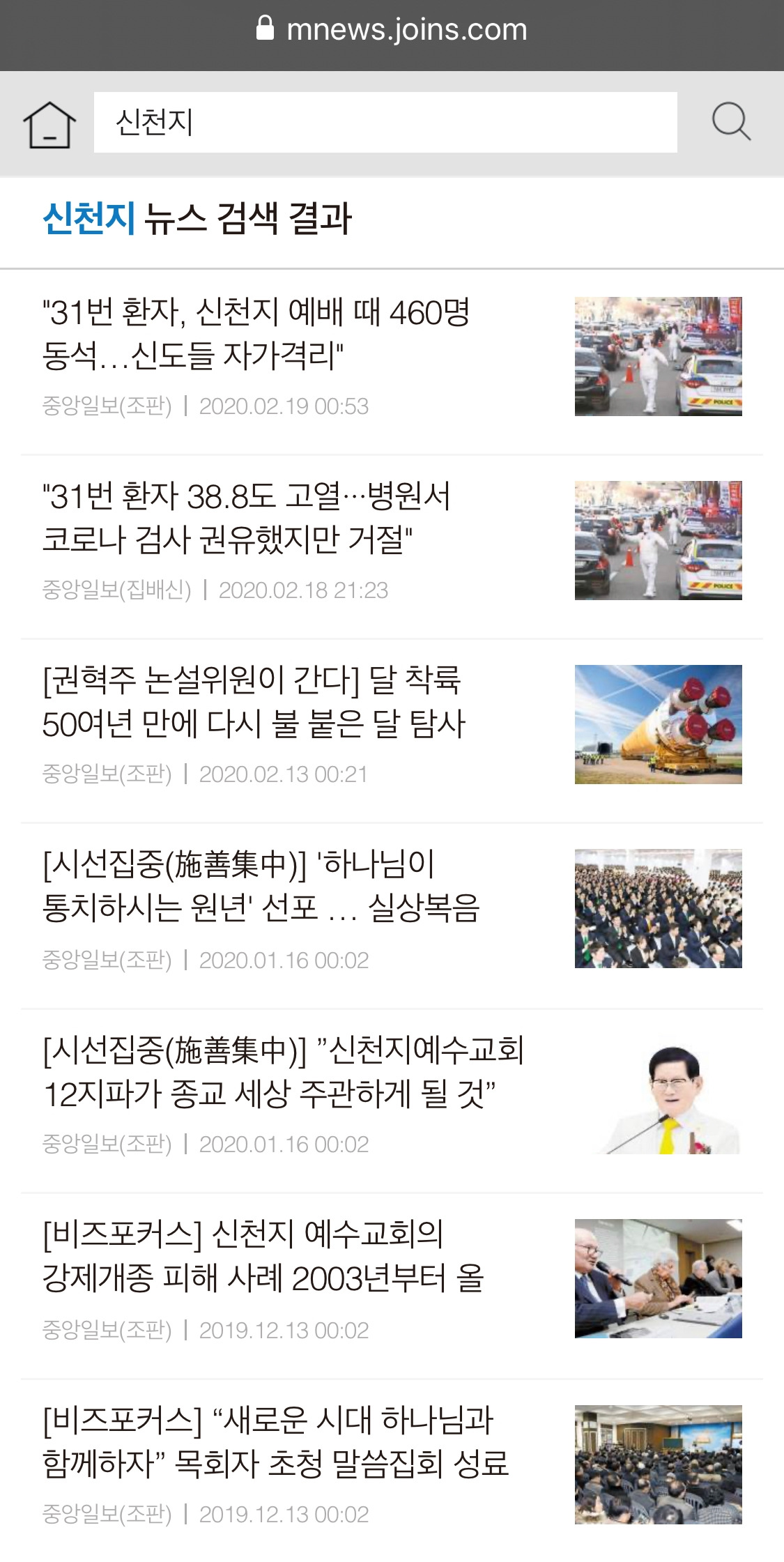 게다가 중앙일보 모바일 사이트에서 ‘신천지’를 검색하면