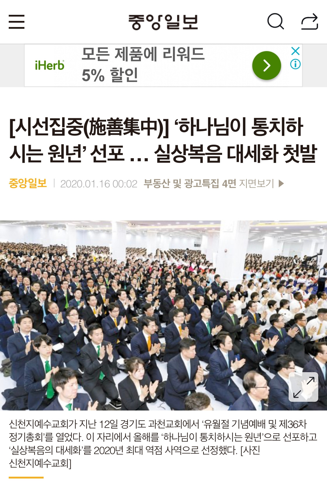 꼼꼼히 살펴보지 않으면 중앙일보가 신천지의 성과를 대서특필한 것처럼 보인다.