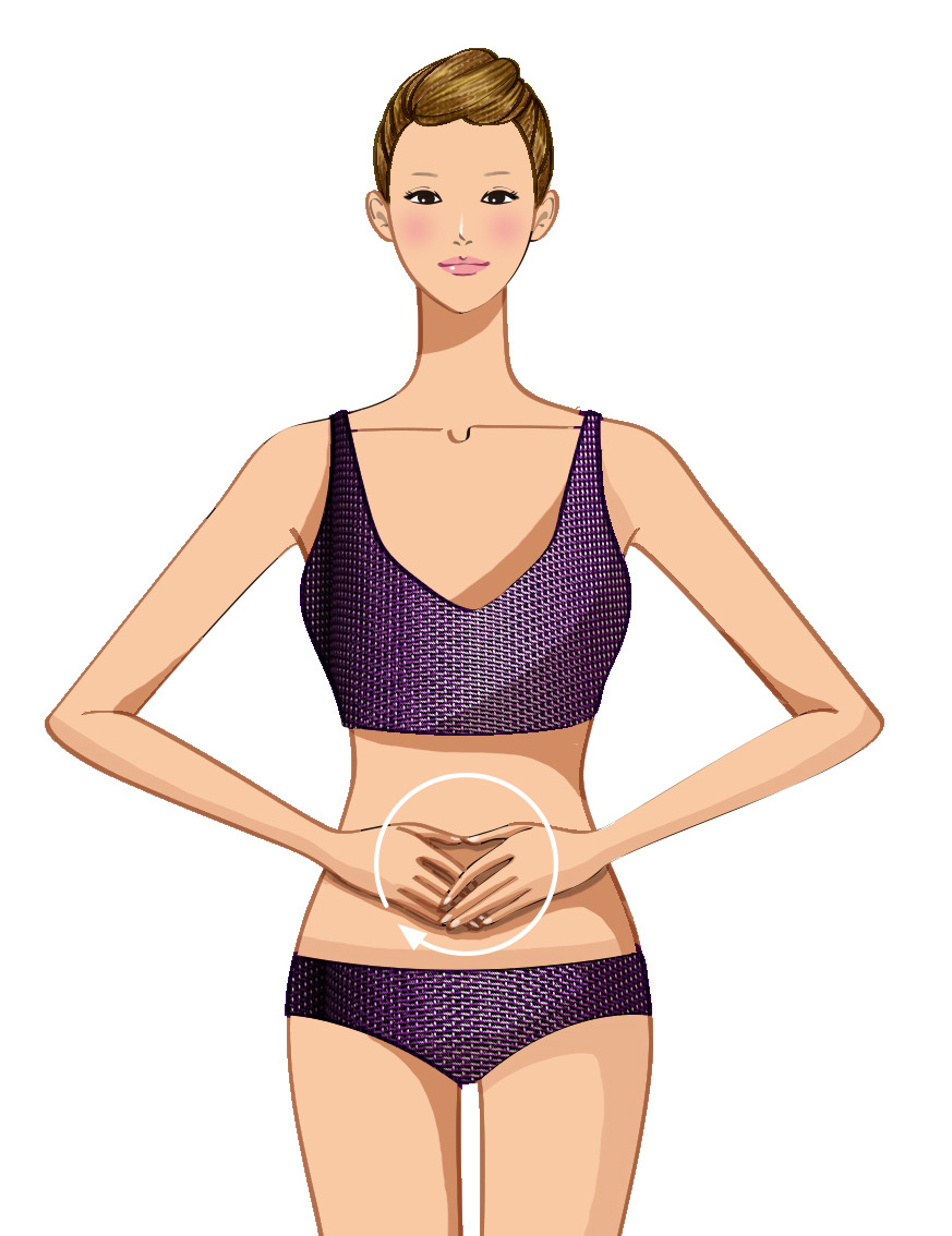 마사지를 시작하기에 앞서 배에서 허리에 걸쳐서 크림을 잘 스며들도록 바른다. 다음으로 양손의 검지, 중지, 약지의 세 손가락의 끝을 사용해서 시계 방향으로 천천히 원을 그리면서 깊게 마사지한다. 양손을 겹쳐서 천천히 깊게 누르듯이 10회 반복한다.