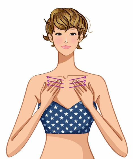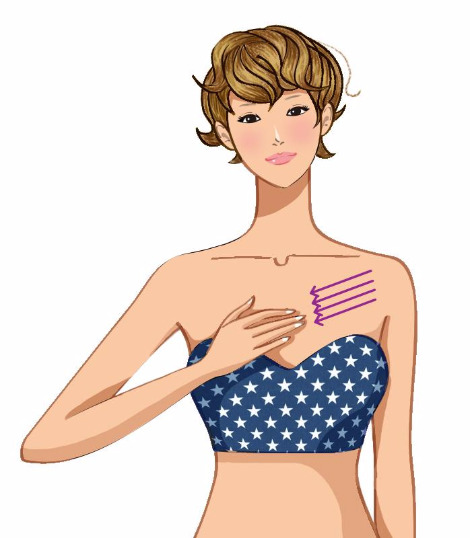 일단 쇄골 아래를 밖에서 안으로 손바닥으로 문질러 보자. 쇄골 아래 부분은 림프가 집중해 있기 때문에 쇄골을 따라서 바깥쪽부터 안쪽으로 네 손가락으로 문지른다. 손가락으로 쇄골 아래의 4군데 정도를 중지로 가볍게 눌러서 자극을 주고 나서 흐르게 하면 더욱 효과적이다.