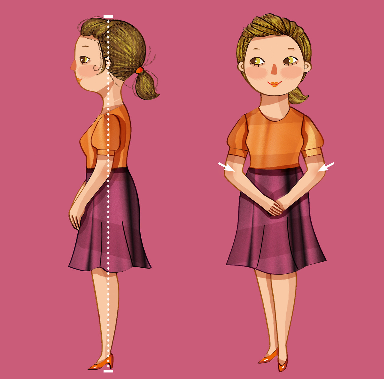 앞으로 모을 때는 몸통과 팔 사이에 약간 공간이 생기도록 하면 훨씬 단정하고 맵시 있게 보인다.