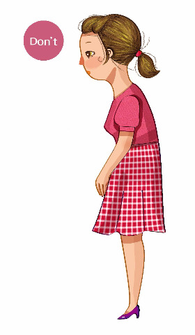 배를 내밀고 서 있는 자세는 피로하고 무기력하게 보인다. 아랫배에 힘을 줘서 배를 들어가게 하고 머리부터 끌어올려지고 있다고 의식해 본다. 옆에서 봤을 때 귀, 어깨, 허리, 무릎 옆, 복사뼈가 일직선으로 되는 것이 가장 이상적이지만, 너무 의식하면 어깨나 허리에 힘이 들어가 부자연스럽게 보일 수 있다. 딱딱하게 굳어서 상대에게 긴장감을 주지 않도록 어깨의 힘을 빼고, 손은 자연스럽게 옆으로 내리거나 앞에서 가볍게 모은다.