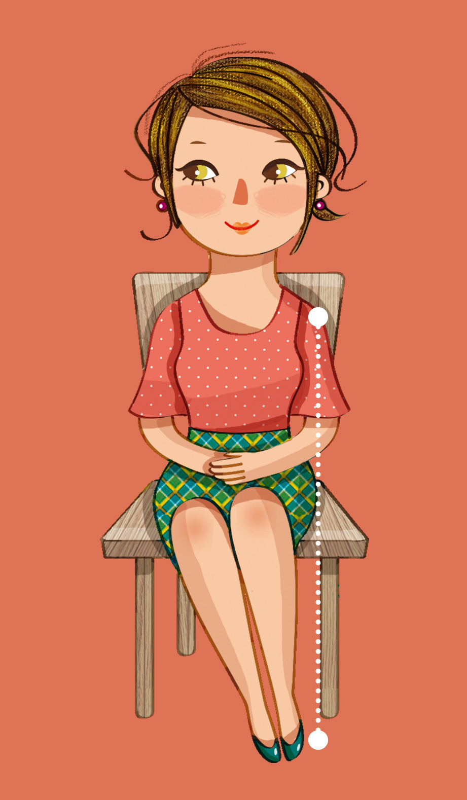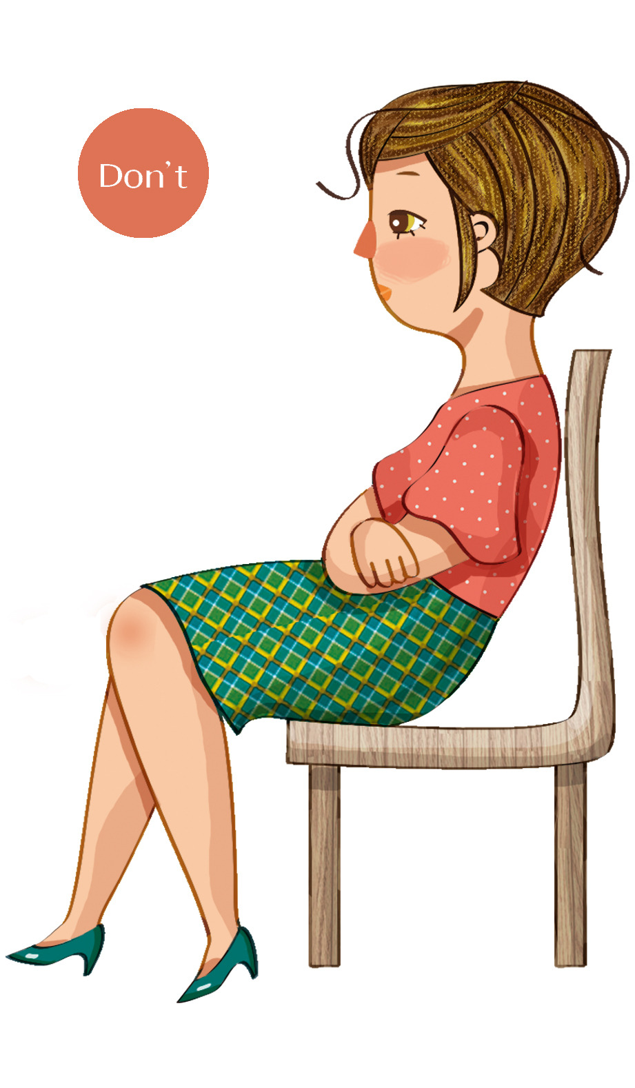 엉덩이 부분만 의자 앞부분에 걸치고 등의 일부분을 의자 등받이에 기대어 앉으면 보기에도, 건강에도 좋지 않다.