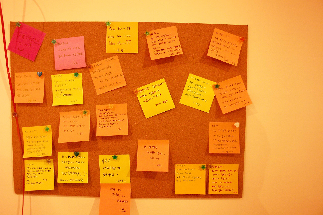 전시장 한쪽에는 포스트잇으로 적을수 있게끔 방명록을 준비했는데, 찾아오신 분들 중 몇분이 축하 메세지를 적어주셨다.