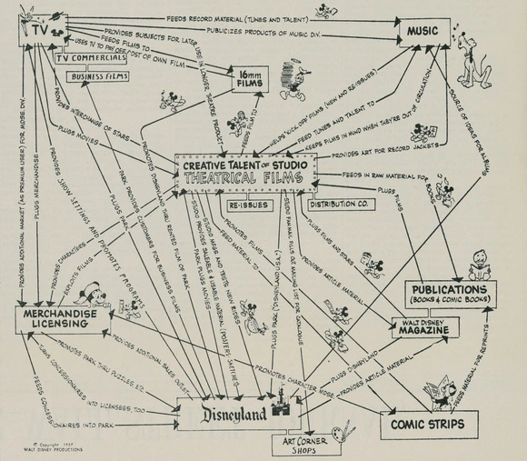 가장 중심에는 당연히 디즈니의 본체와도 같은 "영화(애니메이션)"이 위치하고 있다. 이 중심이 되는 콘텐츠에서 규정한 캐릭터와 요소들이 활용되어, 이와 연계된 TV 방송, 테마파크, 상품, 음악, 축제, 잡지, 서적 등까지 뻗어나가고, 이는 다시 새로운 콘텐츠의 탄생으로 이어진다. 그렇다면 디즈니는 왜 이러한 전략을 세웠을까? 그리고 이 전략은 어떻게 지금 이 순간까지도 이어져 올 수 있었던 것일까? 이는 곧, 콘텐츠를 제작하는 데에 있어서 반드시 필요한 요소들이 있고, 그 요소들을 적극적으로 활용한다면 다양한 산업으로 뻗어나가는 것이 훨씬 용이하기 때문일 것이다.