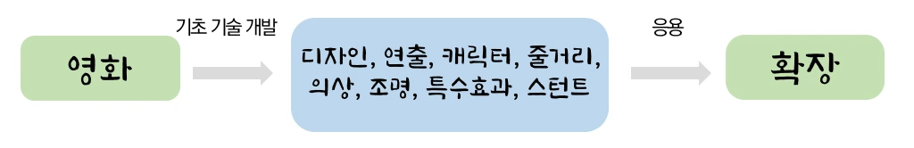 가령, 하나의 영화를 만들기 위해서는 디자인, 캐릭터, 줄거리, 조명, 의상, 특수효과, 스턴트 등 다양한 방면에서의 기초 기술 개발이 필요하다. 인물, 사건, 배경이라는 이야기 구성의 3요소들이 이미 영화 콘텐츠를 제작하면서 만들어지기 때문에, 이를 바탕으로 테마파크를 구현하고 축제를 만들어내며 굿즈를 제작하는 것이 훨씬 용이한 것이다. 뿐만 아니라 소비자 역시도 하나의 콘텐츠를 좋아하게 되었을 때, 그 콘텐츠를 활용한 다양한 2차 생산물들을 몰입감을 가지고 즐길 수밖에 없게 된다.
