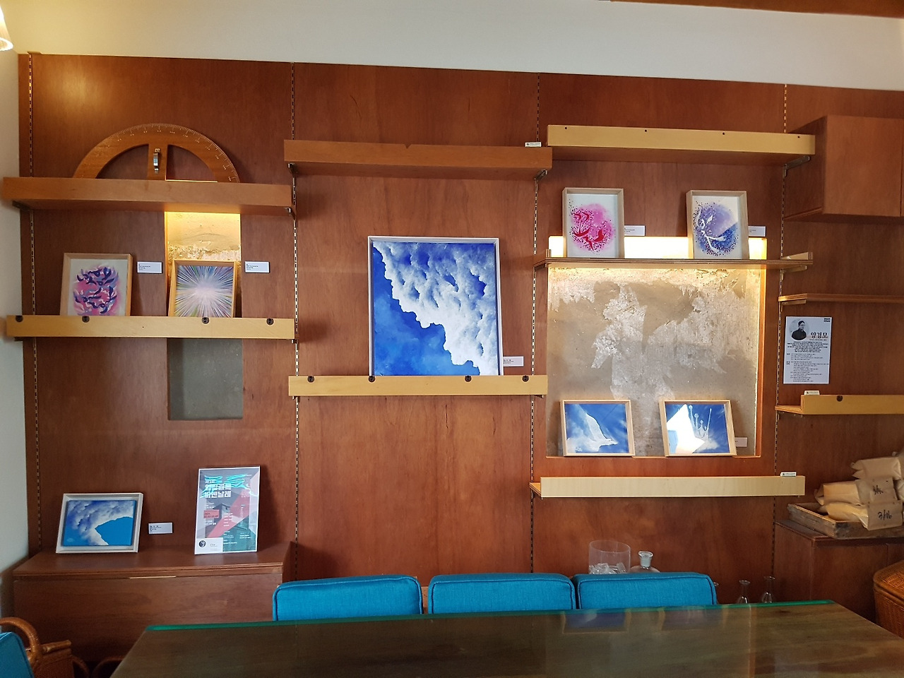 "육각 커피에 있는 작품은 양경모 작가님 작업이에요. 점점 시력을 잃어가는 중에 계셔서 세밀한 풍경보다는 하늘이나 구름처럼 커다란 자연을 중심으로 그려요. 시력은 약해지시지만 도리어 우리는 보지 못하는 아름다움을 담아내시는 것 같아요"