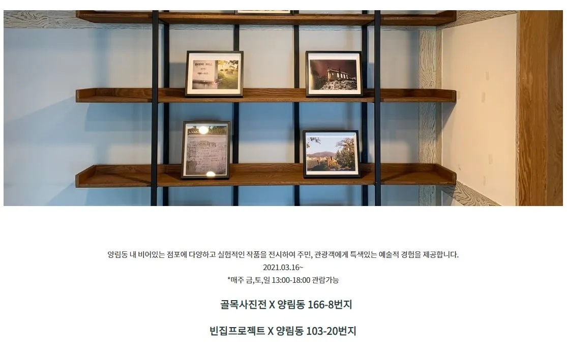 16곳의 식당과 카페, 13명의 작가들이 작품을 출품해 마을과 예술의 힘으로 만들어 가는 양림골목 비엔날레(3.3-5.9)