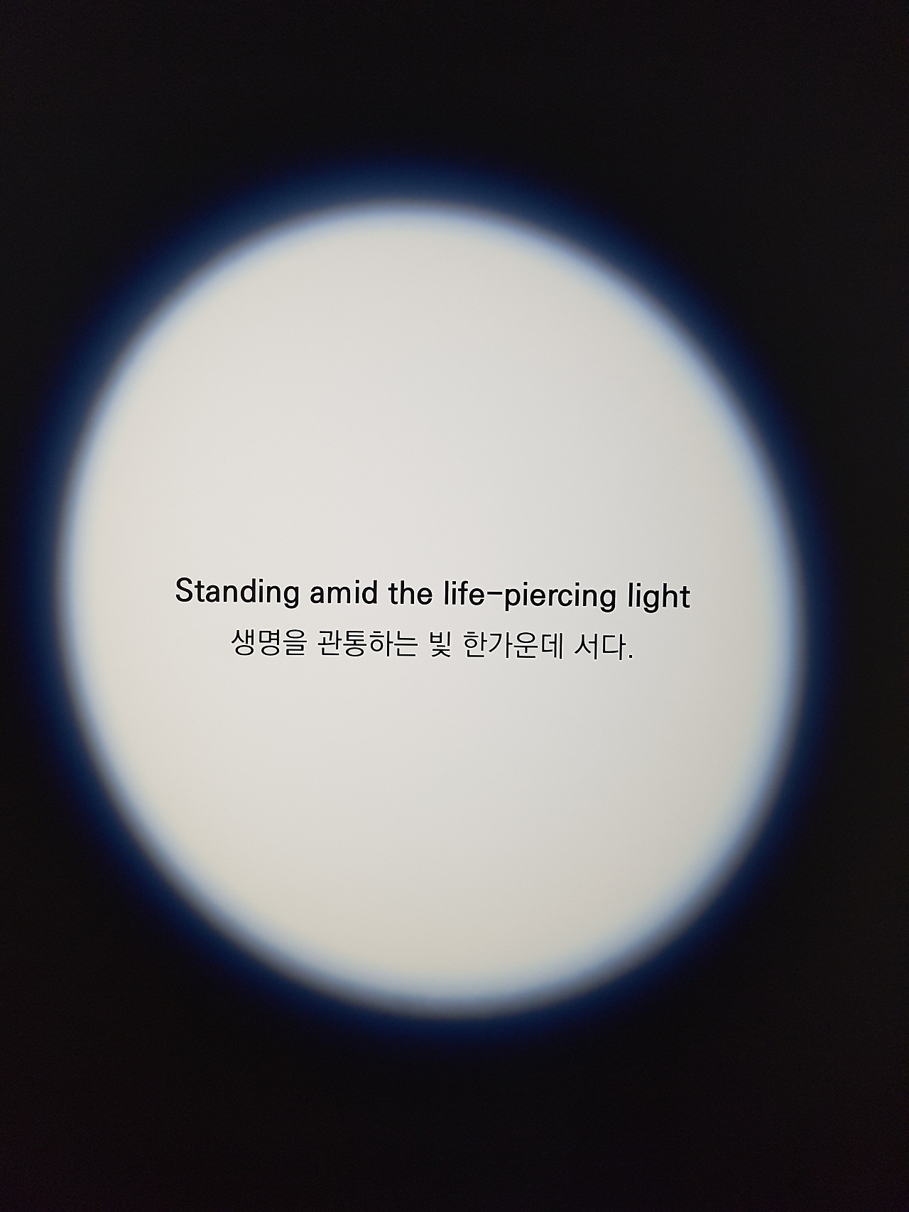 '사라지는 시간 속에서 영원한 것을 찾다"라는 부제가 붙은 그의 전시를 보기 위해선 거대한 어둠 속으로 들어서는 일이 가장 먼저였다. 작가가 보내는 신호를 따라 빛의 방향을 향해 걷다 보면 어느새 탄생과 죽음의 경계에 다다른다.