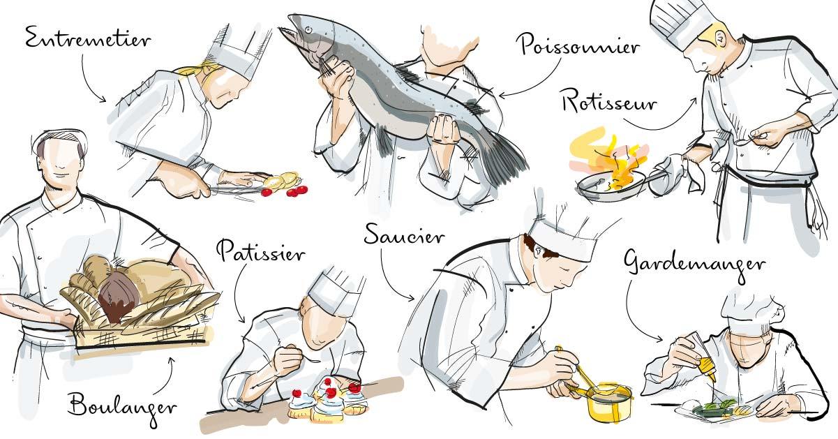주방 운영의 생산성이 향상되고 바쁜 시간에 많은 양의 식사를 하려면 주방시스템은 각 부분별 여러 가지 역할로 나뉘는데 각 부분별 주방장의 역할은 다음과 같다. 소시에(Saucier/Sauté Chef)라고 불리는 요리사는 음식을 볶는 역할과 함께 소스와 육수를 만드는 역할을 하고, 부쳐 셰프(Butcher Chef)는 육류 및 가금류를 각 역에 배달하기 전에 준비한다. 그리고 생선 요리사(Poissonnier), 고기를 굽는 로티셰르(Rotisseur, Roast Chef), 에피타이저와 샐러드등 차가운 요리를 담당하는 가르드 망저(Garde Manger), 디저트를 담당하는 파티시에(Pattisier, Pastry Chef)등 특정 직무를 가진 요리사들이 부분별 주방장 역할을 한다.