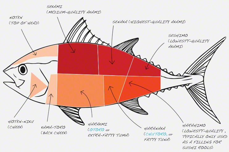 위의 그림은 참치를 부위별로 설명한 그림입니다. 참치회 부위는 소, 돼지의 부위별 분류와 비슷할 정도로 매우 복잡합니다.