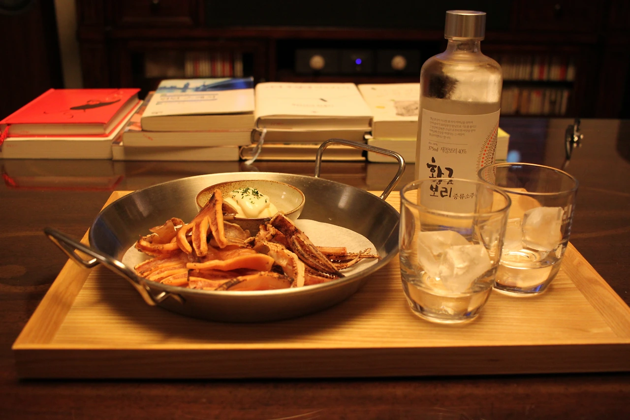 맹숭맹숭하게 드라마를 즐기기에는 모자람이 있어 야식을 고민합니다. 배부른 건 싫고, 기름진 것도 싫다 보니 마른오징어와 함께 얼음탄 소주 온 더 락 생각이 나서 냉장고를 뒤적입니다. 소금을 넣은 미온수에 마른오징어를 넣고 10분 정도 불린 다음, 가스불에 살짝 구워 시원하게 얼음을 탄 소주와 함께 마련한 야식입니다. 청양고추를 살짝 썰어 넣은 마요네즈에 간장 반 스푼 넣습니다. 살짝 구운 오징어를 간장 마요네즈 듬뿍 찍어 먹으면 차가운 소주와는 찰떡궁합입니다.