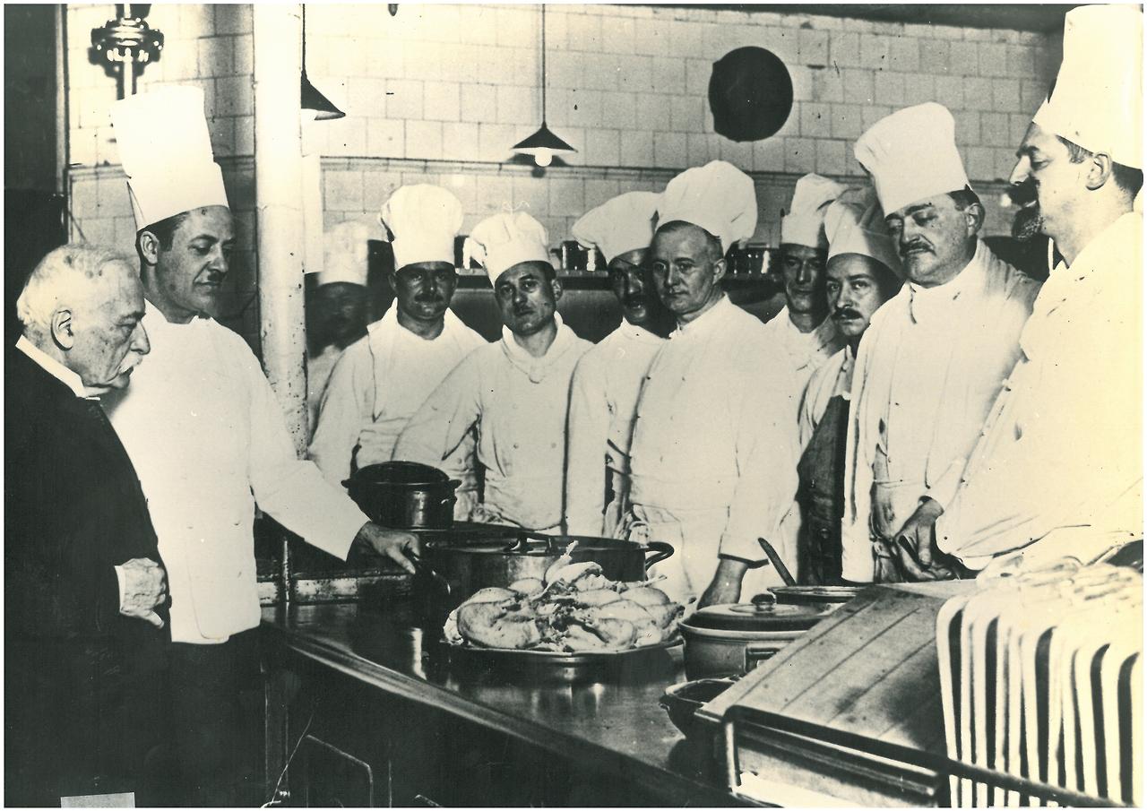 레스토랑이 산업으로서 발달하면서 '오귀스트 에스코피에(Auguste Escoffier)'가 등장합니다. 그의 저서 '요리 안내(le cuisine culinaire)'에서 주방 조직을 체계화하고 정리하여 주방 책임자를 '셰프 퀴지너(Chef cuisinier)'라는 이름으로 명명합니다. 조리교육의 체계적인 교육법을 세우고 주방장인 셰프를 사회적으로 존경받는 직업으로서의 지위를 올려놓으며 '요리의 왕'이라는 칭호를 얻습니다.