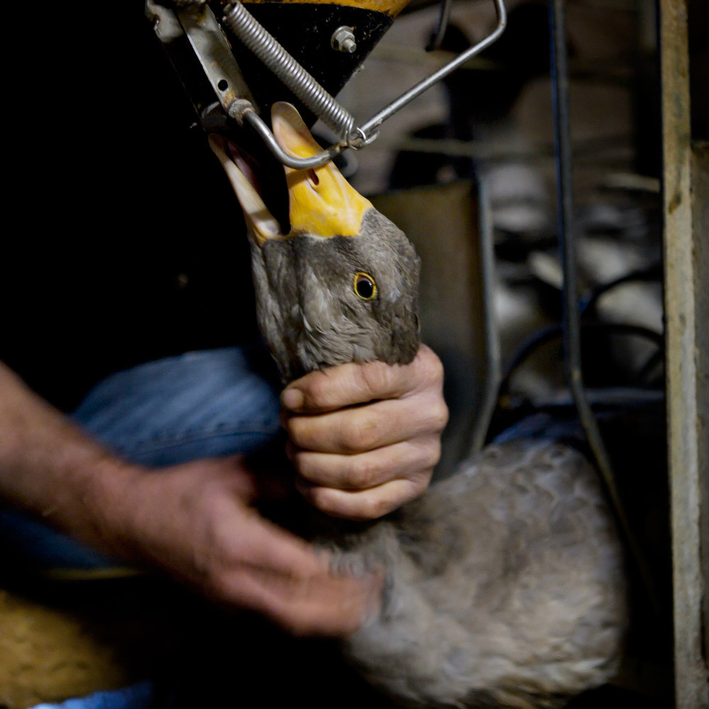 기원전 1500년 전부터 이집트에서 거위 간이 생산되기 시작하고, 로마시대를 거쳐 유대인의 푸아그라 생산기술은 루이 14세의 프랑스에까지 미식의 상징으로 전해져 내려옵니다. 이렇듯이 동물학대의 전통인 가바쥬(gavage)라고 불리는 강제 먹이 주입 방법은 현재에까지 이르러서도 3500년간 거위와 오리를 고문하여 푸아그라로 생산되고 있습니다.