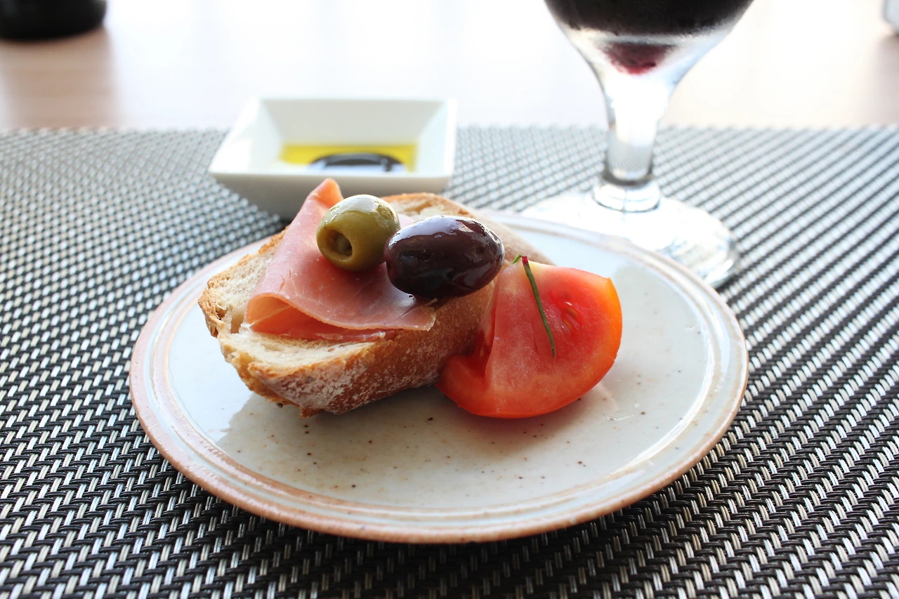 따뜻함이 살짝 배인 구운 바게트와 얇게 썰은 하몽 세라노 한쪽, 요즘 애정 하는 엔초비가 들어 있는 그린 올리브, 높은 몸값 자랑하는 칼라마타 블랙 올리브와 신선한 토마토 한쪽을 올리고 타파스처럼 아침을 먹습니다.