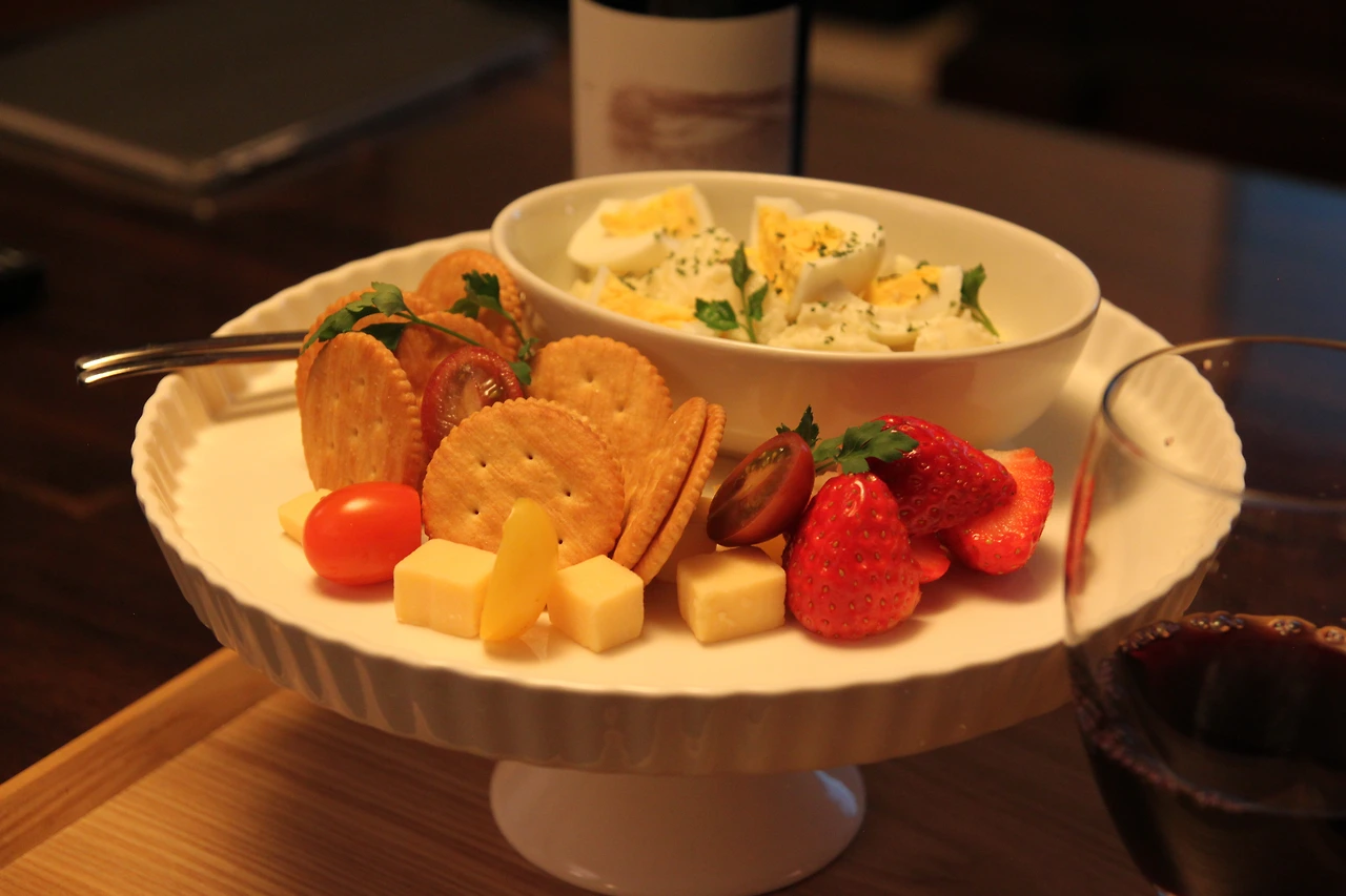 결국은 야식으로 달걀 샐러드와 치즈 크래커를 먹습니다.