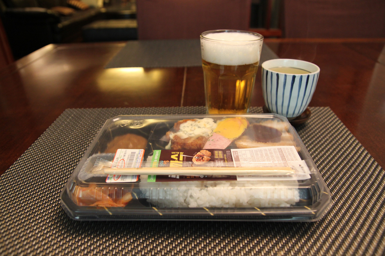 저녁 회의 때 지급된 도시락을 집으로 가져와 따뜻한 보리차 한잔, 맥주와 함께 저녁 한 끼를 먹습니다.